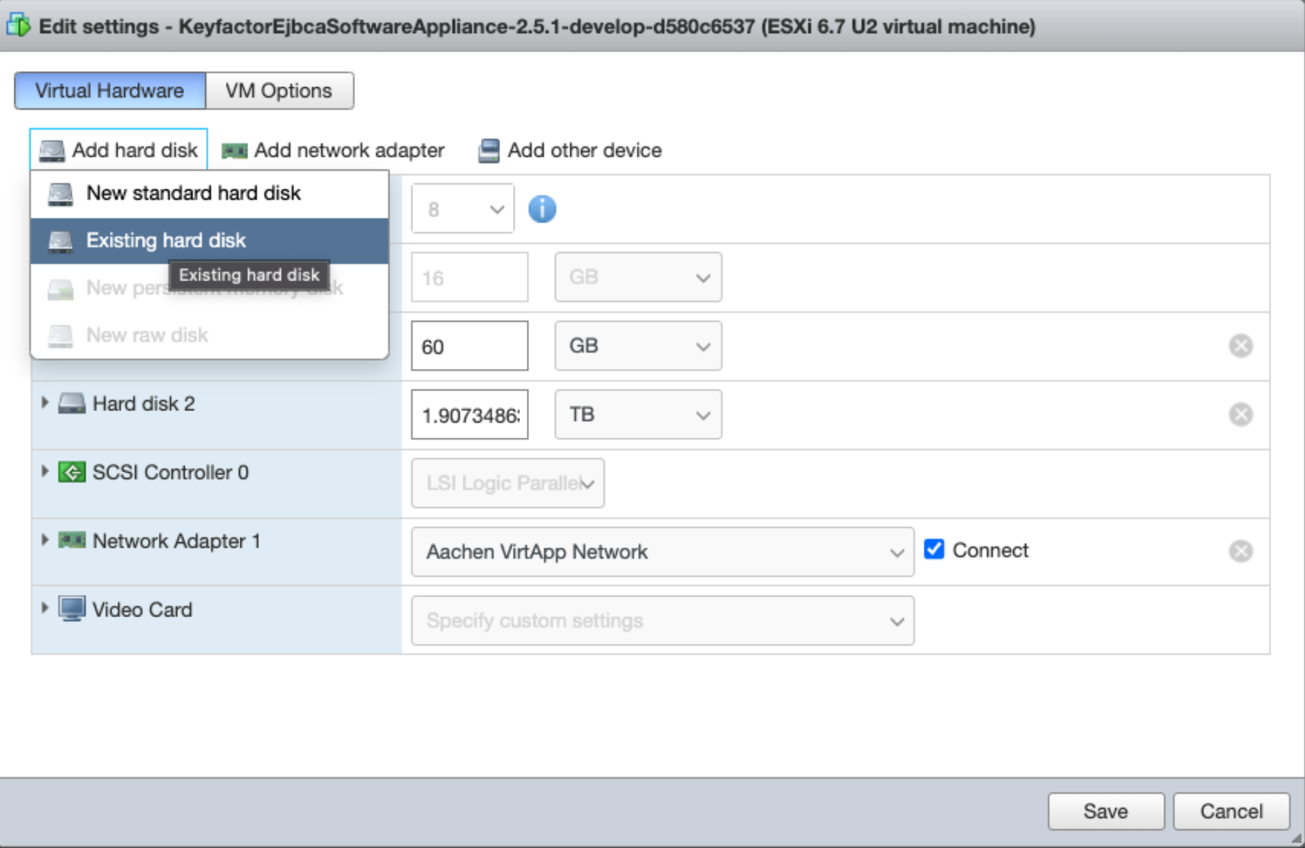 - Install/Import the new version of the Software Appliance, e.g. 2.5.1 on the newly created VM. Detailed instructions can be found at Installation Instructions for new VM on ESXi.