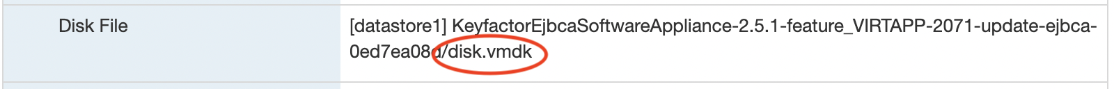 Since we want to update the firmware, we have to search for the disk.vmdk. In our example, the firmware disk (disk.vmdk) is located on Hard disk 1.