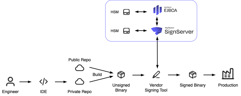 The diagram below shows how EJBCA and SignServer integrate into a CI/CD pipeline to enforce these controls and provide a trusted foundation for secure boot.