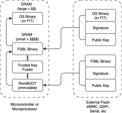 Of course, more stages can be (and are) added by different secure boot mechanisms on different devices. For example, in UEFI boot, the core processor can load U-Boot as the FSBL, which then loads UEFI, which then loads the Operating System. This UEFI model is common in ARM SBSA platforms and is used in ARM reference platforms using Trusted-Firmware or in implementations like QEMU.