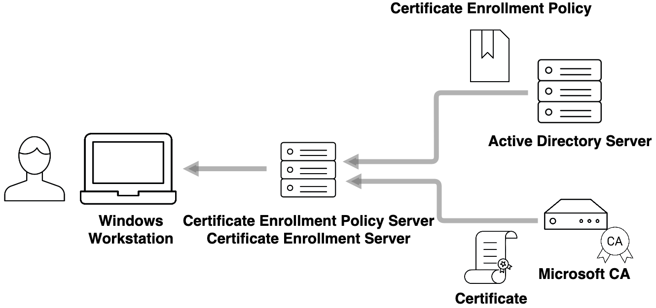 While this solution works well in small-scale environments, once multiple domains and forests need to be taken into consideration it scales poorly, requiring an equal number of CEP and CES servers and Microsoft CA instances to the number of domains.