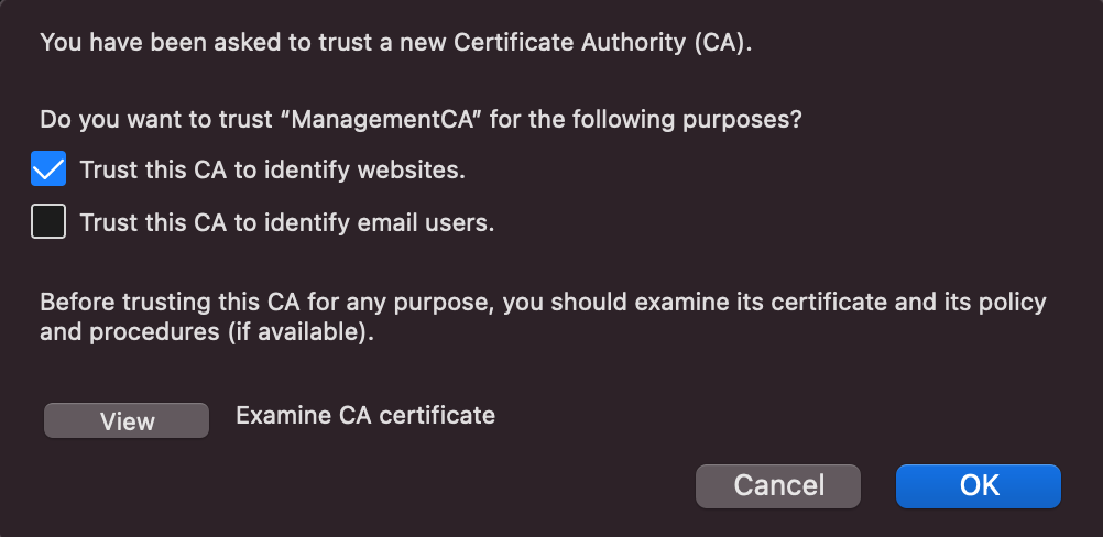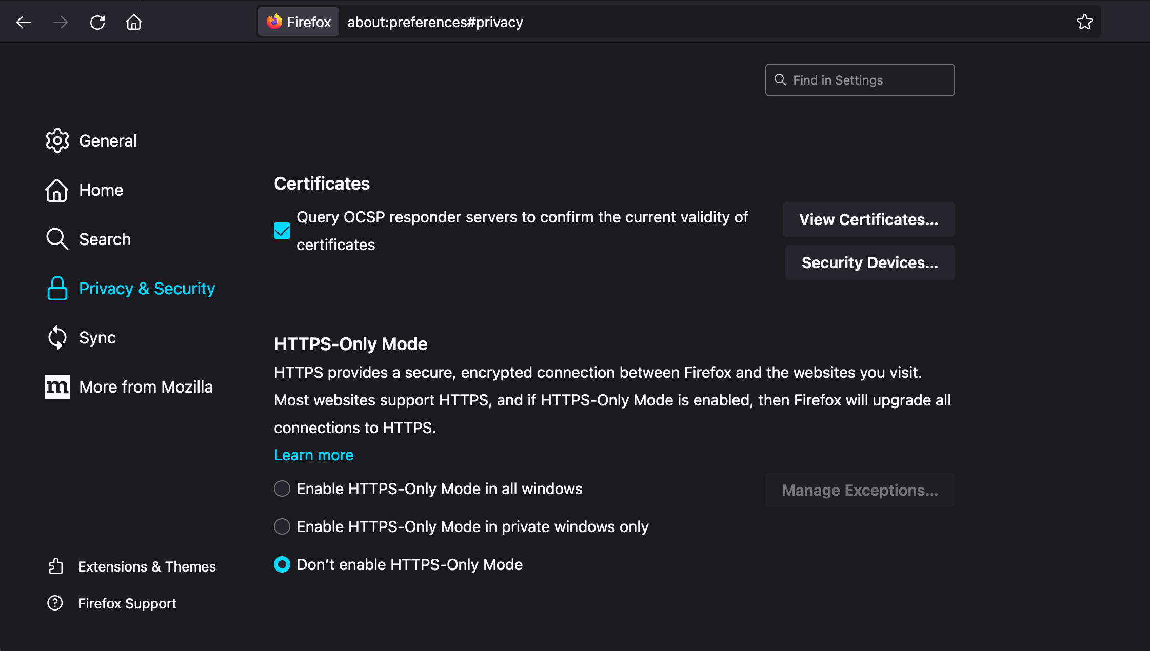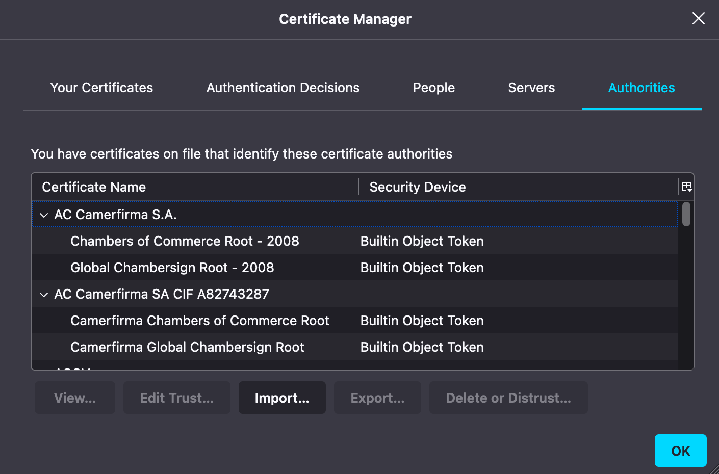 Download as PEM for the Test Drive CA certificate and save it on your computer. You can also use the cert file that came with the Universal Orchestrator bundle named kf-testdrive-cert.crt. Access the browser’s certificate store and add the ManagementCA certificate to it. In Firefox, type “about:preferences” in the address bar or select the Preferences Menu and go to settings. Click Privacy and Security and then View Certificates.