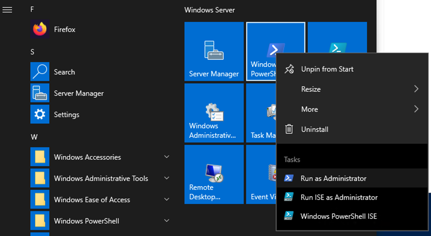 If you are not logged in as an administrator, right click the PowerShell icon and select Run as Administrator.