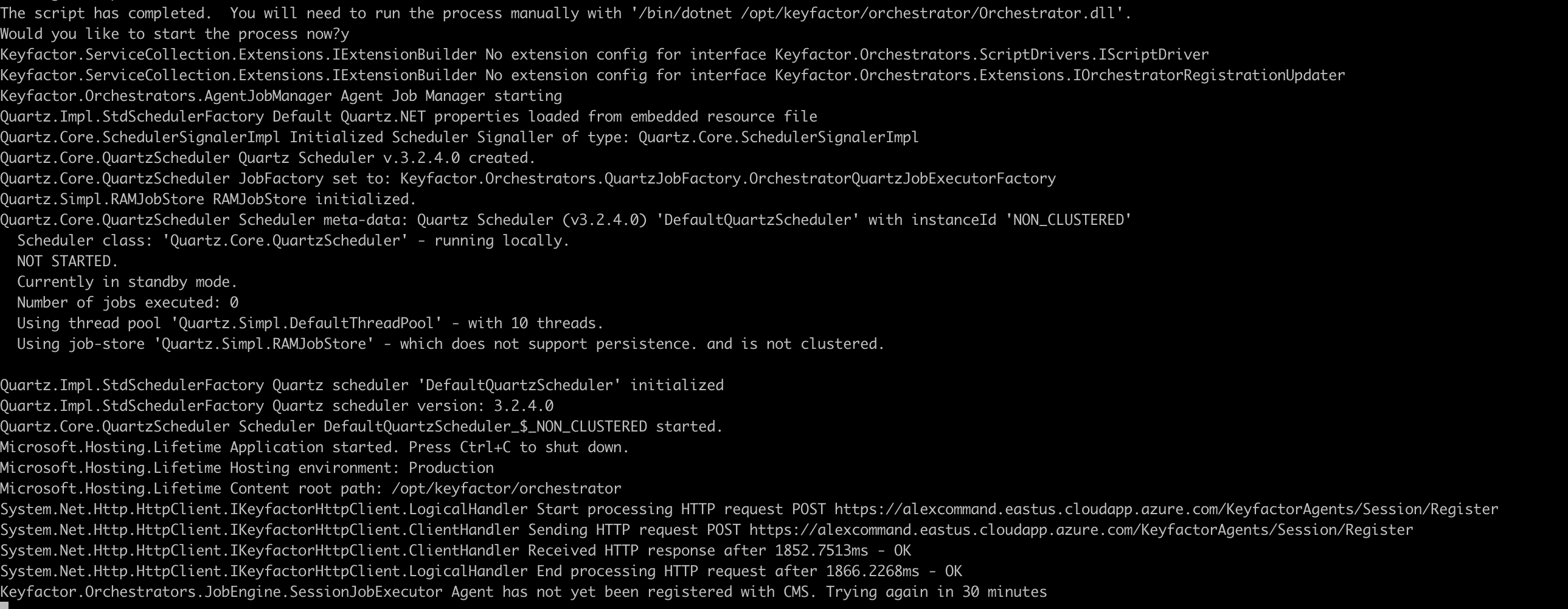 At the end, the script will start the service and ask you to register it in Keyfactor Command.