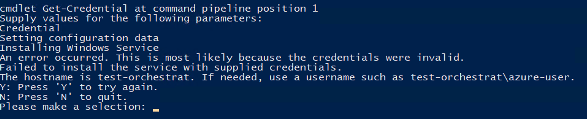 Press Y to repeat the process, or N to exit the script. Pressing Y will prompt you for credentials. If the credentials are valid, the script will prompt you for the Test Drive instance password. Use the password that was generated as part of the Test Drive. Once prompted, paste your password using the powershell Edit → Paste the value into the script using the PowerShell Edit/Paste method in the terminal window. Once pasted into the PowerShell window, the service will be installed and started automatically.