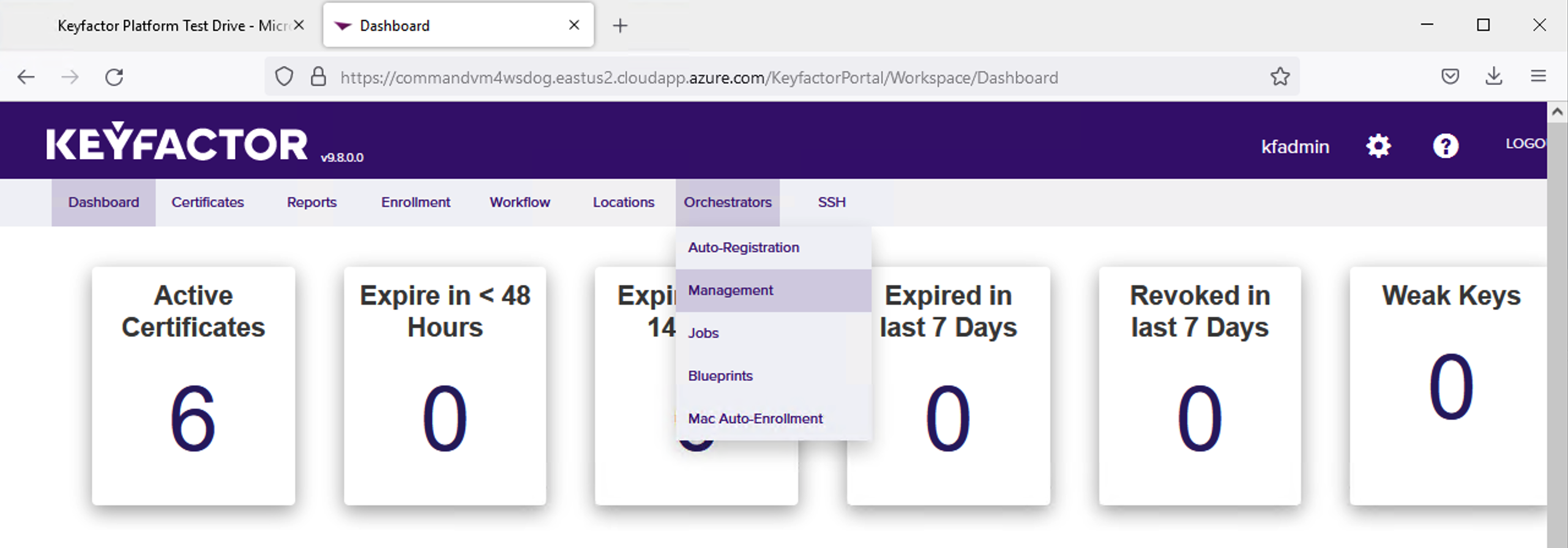 After completing the Initial Setup of the Command Test Drive, you’re ready to begin exploring Keyfactor Command’s certificate lifecycle capabilities and core functions. This page provides guided examples of the most common workflows and use cases.