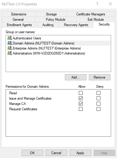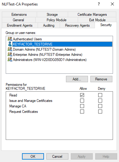 For the Orchestrator to sync certificate data between the Microsoft CA and the Keyfactor Command Test Drive, it is necessary to grant security permission for the Orchestrator to have Read access to the Microsoft CA. The following configuration steps take place on the local Microsoft CA server.