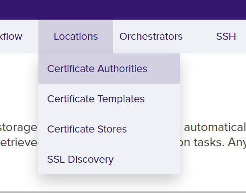 Once logged into Keyfactor Command, the Dashboard will appear with navigation links across the top. Click Locations and access the Certificate Authorities tab.