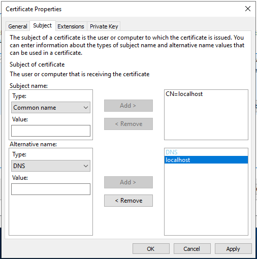 On the Subject panel, enter the information for the certificate subject, such as Common Name or Full DN. Be sure add an Alternative name with the Type set to DNS and provide the value.