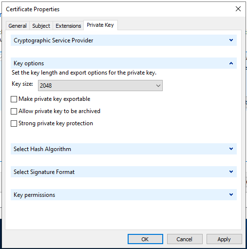 On the Private Key panel, set the Key size to 2048. Click OK.