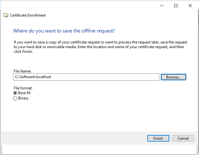 Give the certificate signing request file a name and save it as a Base 64 file format. Click Finish.