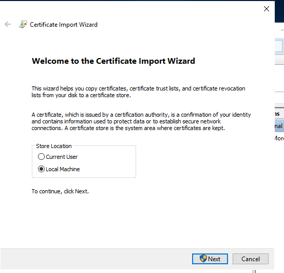 Copy the new certificate to the IIS web server. Double-click the certificate file to launch the Certificate Import Wizard. Be sure to set the Store Location to the Local Machine. Click Next.