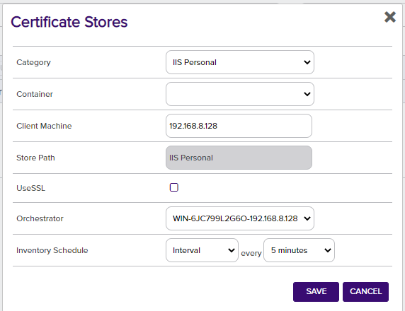 Set the Certificate Store Category to IIS Personal from the drop-down list. Enter the IP address of the IIS web server for the Client Machine. Select the Universal Orchestrator that you deployed with the Keyfactor Command Test Drive for the Orchestrator. Set the Inventory Schedule as desired. Click Save.