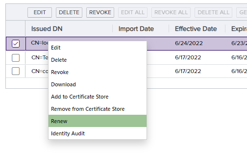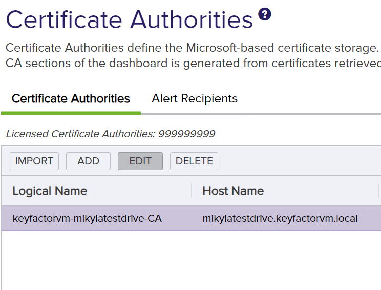 EJBCA comes pre-configured with both the ManagementCA and the IssuingCA integrated into Command. Select the EJBCA ManagementCA and click Edit.