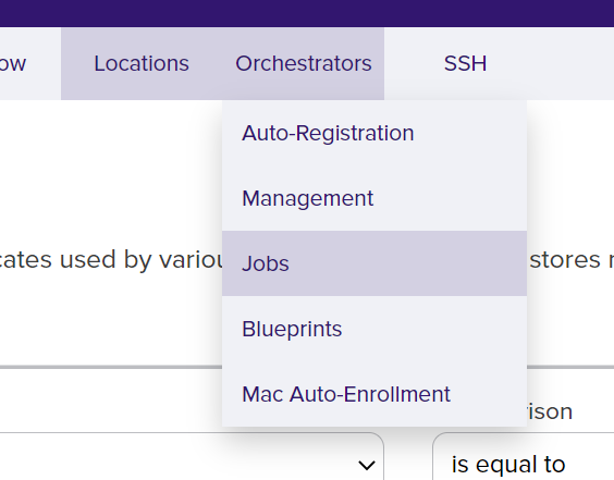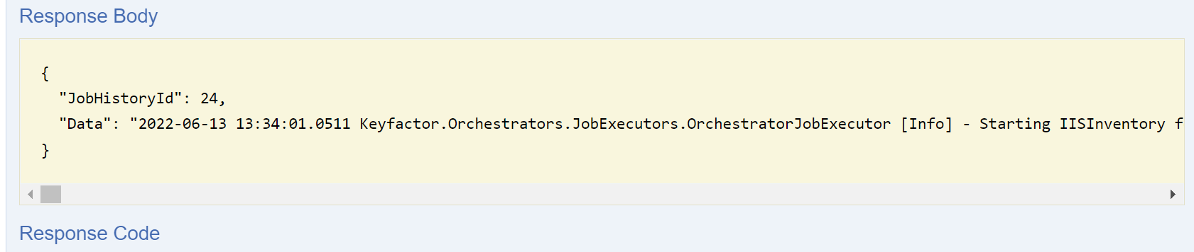 In the Keyfactor Command console, select Orchestrator -> Jobs from the navigation menu bar. The list of jobs should contain the job that was configured in the previous step. It may take up to 5 minutes for the Universal Orchestrator to pick up the new inventory schedule from Keyfactor Command. Once the Universal Orchestrator completes the job, the results will show up in the list on the Job History panel of the Orchestrator Job Status page.