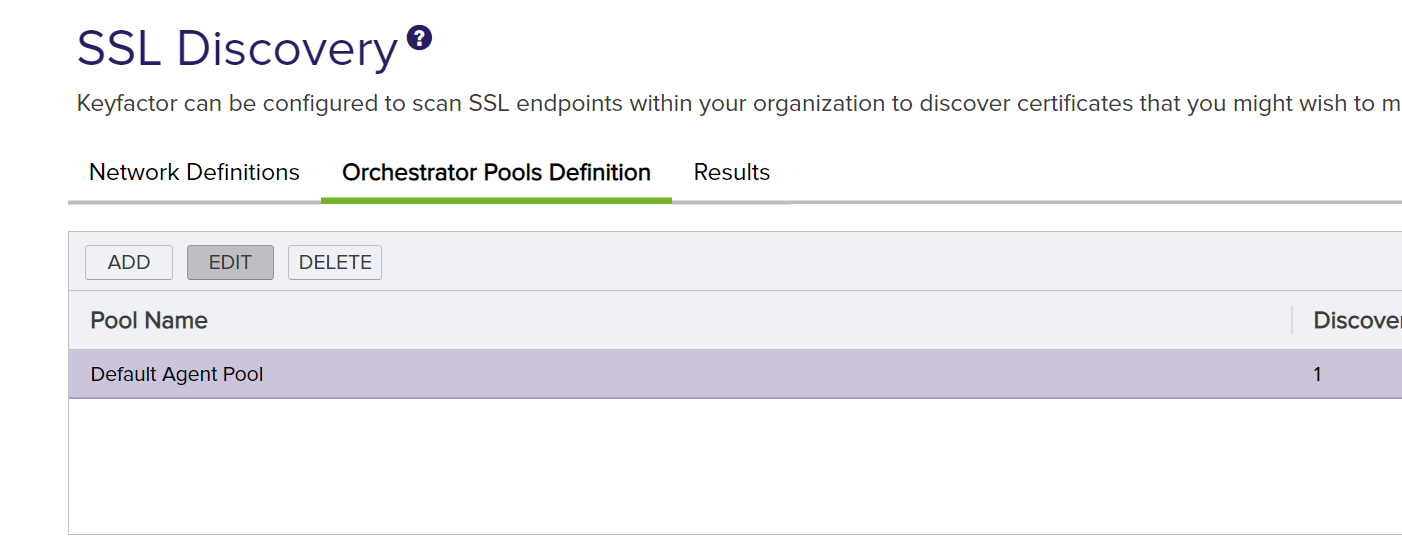 On the SSL Discovery page, click on the Orchestrator Pools Definition tab. Highlight the Default Agent Pool and click Edit.