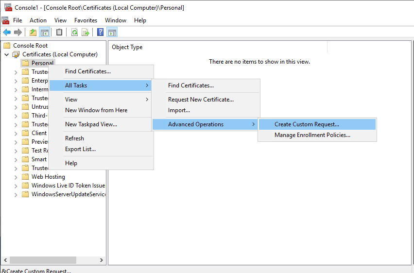Right-click on the “Personal" store and select All Tasks -> Advanced Operation -> Create Custom Request.
