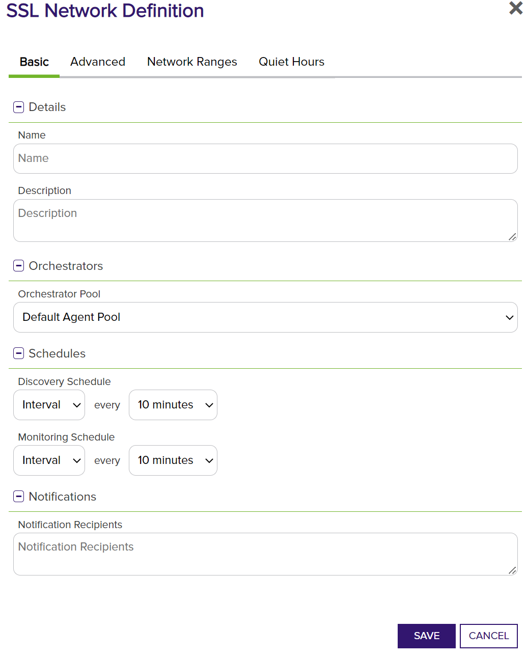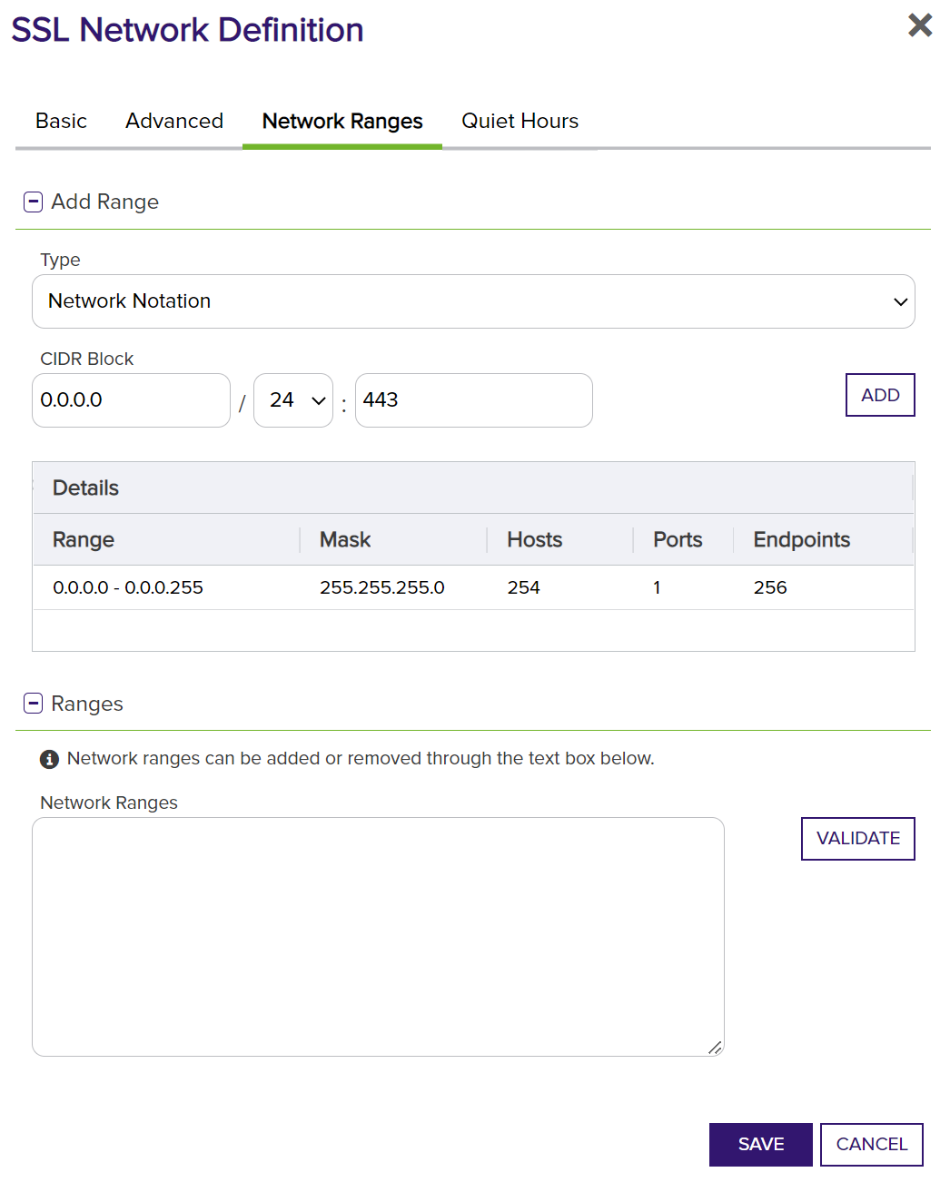 Next, in the same dialog, navigate to the Network Ranges tab and add the locations to the ranges that need to be scanned. For any IP address range that you would like to add, click the ADD button to the right to add that IP address range to the scan.