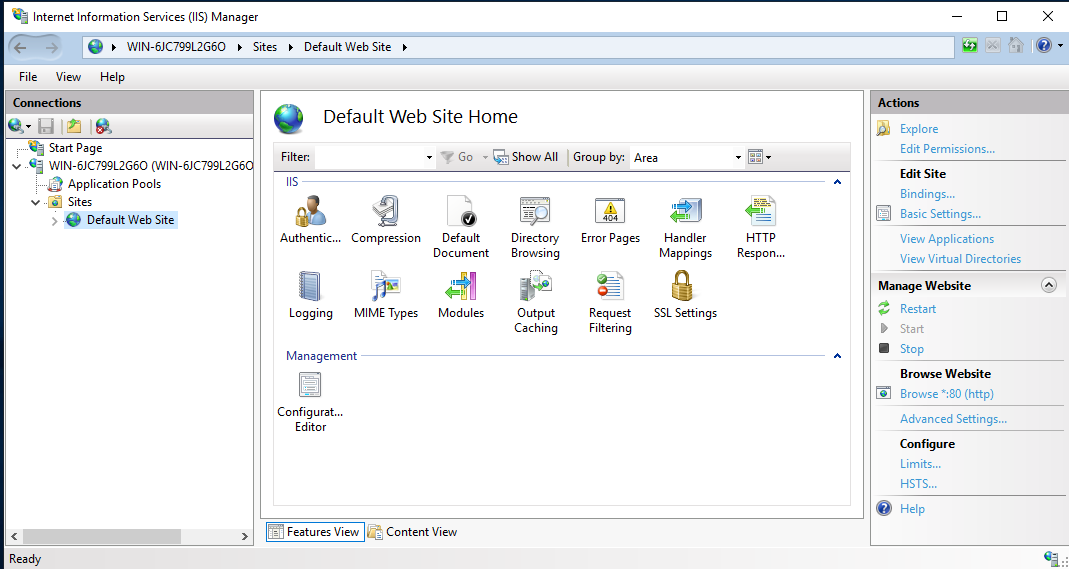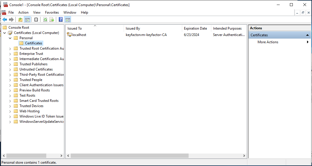 If your IIS web server does not have an existing certificate, you will need to install a certificate into the IIS Personal certificate store and update the bindings on the website. If there is already an existing certificate on your web server, you can skip this section and proceed to configure Keyfactor Command to manage the IIS Personal certificate store.