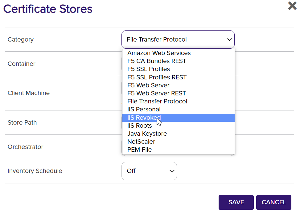 A dialog will open to allow for configuring a certificate store. The Category field is the type of certificate store. By default, the installed orchestrator on Windows can use File Transfer Protocol or any of the IIS categories, and the installed orchestrator on Linux can only use File Transfer Protocol. To add another category, refer to Reference 5.