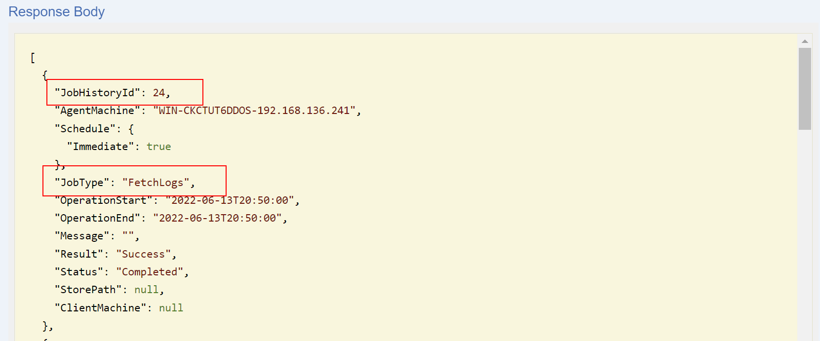 Click Try it out! and see the information displayed. After finding the fetch logs job, copy the JobHistoryId to be used in the next API call.