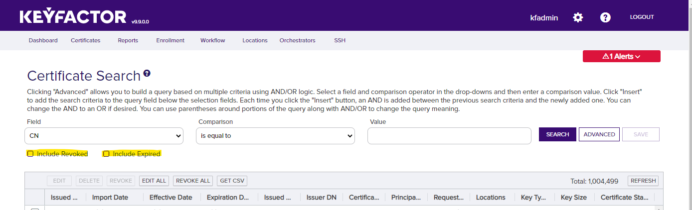 If you wish to include certificates that are expired or revoked, you will need to select the appropriate options on the Certificate Search page.