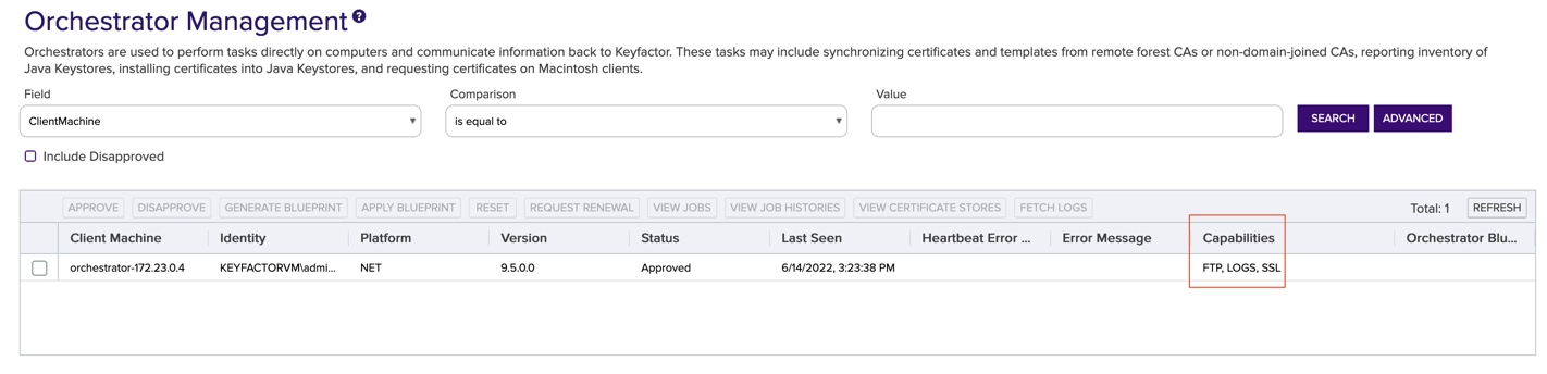 An important thing to note is the orchestrator Capabilities which can be seen in the orchestrator grid. These capabilities default to CA, FTP, IIS, LOGS, SSL, and TemplateSync for Windows based Universal Orchestrators and FTP, LOGS, and SSL for Linux based Universal Orchestrators. Refer to the next sections to learn how to use each of these capabilities.