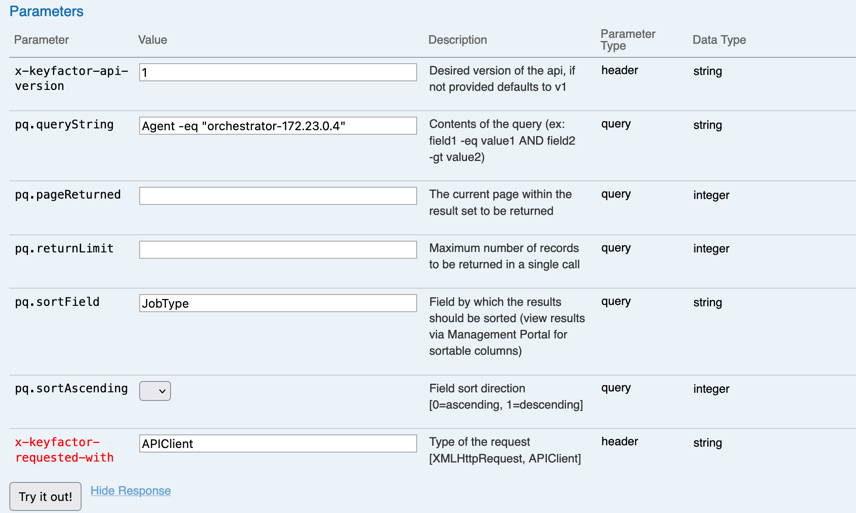 This is the list of all the API endpoints supported for Keyfactor Command. The first endpoint we need to open is GET /OrchestratorJobs/JobHistory.